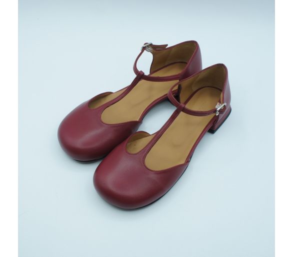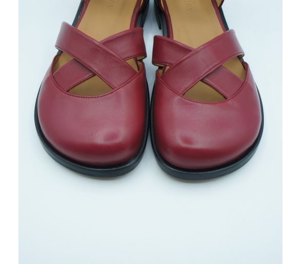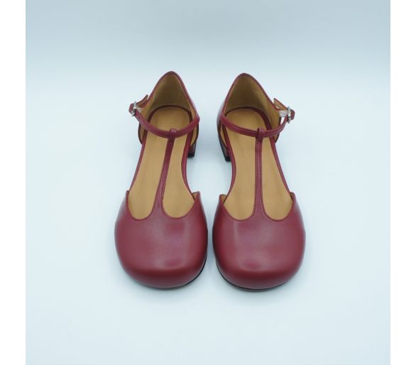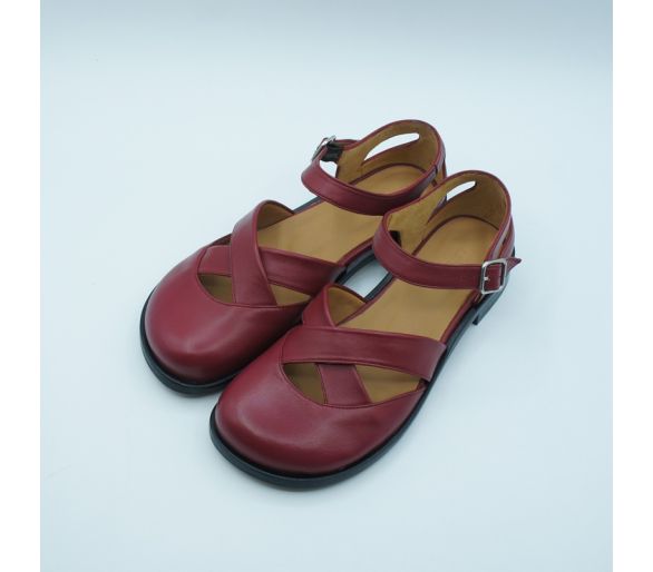 Exterior: piel color burdeos Interior: piel Plantilla: piel Cierre con tiras sobre el empeine y cierre con hebillas regulables