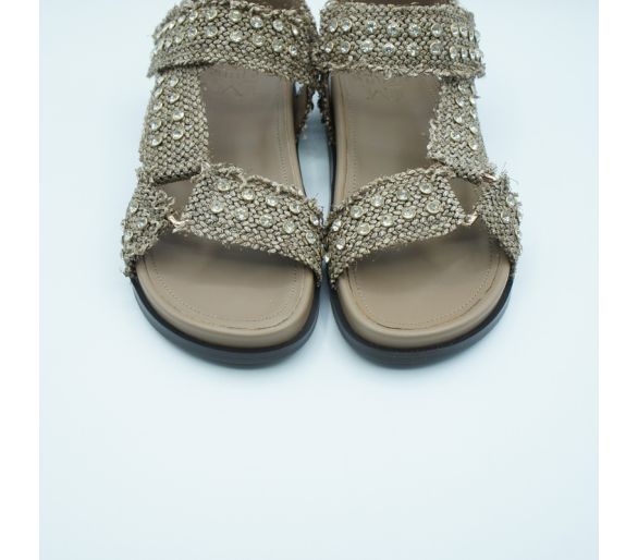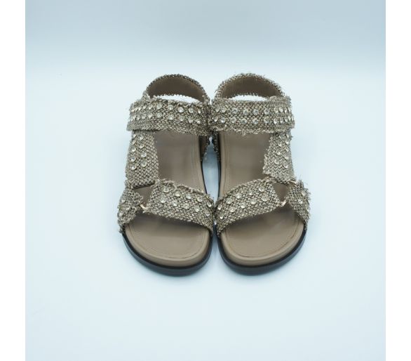 Sandalia plana fabricada en ante color fucsia, con tiras entrelazadas sobre el empeine con tachas formato pirámide en dorado. Cierre con tira al tobillo y hebilla regulable. Tacón de 2 cm. Plantilla en piel. Fabricada en España.