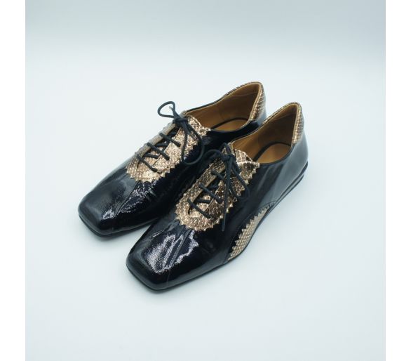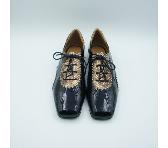 Exterior: charol en negro y color caramelo Interior: piel Plantilla: piel Tacón de 4cm Suela goma antideslizante