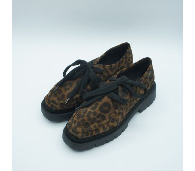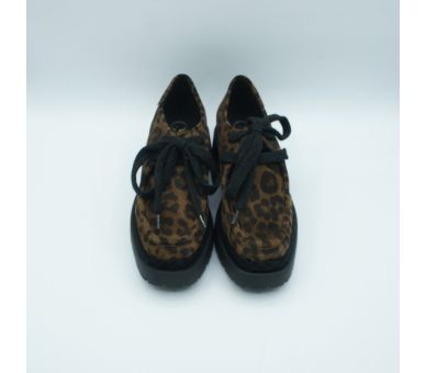 Los botines bajos Candia de Gaimo combinan la inspiración wallabee con un diseño moderno y femenino en piel ante suave con estampado leopardo. Confeccionados en piel suave, destacan por su diseño con bordón ondulado, cordones jaspeados y una banda trenzada de piel sobre la suela. Incorporan plantilla acolchada y transpirable, junto a una suela truck ligera al tono que aporta comodidad y estilo. Hechos a mano en Arnedo, La Rioja, estos botines de mujer son una opción versátil y moderna para completar tus looks de invierno con un aire desenfadado y original.