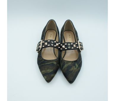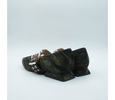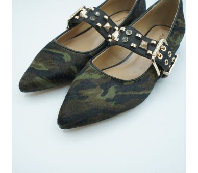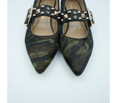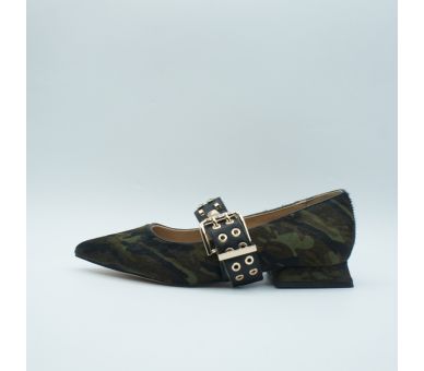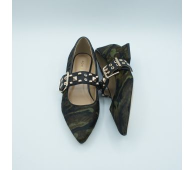 Zapato plano con detalle de tira y hebilla ancha sobre el empeine con tachas en dorado y plateado. Fabricado en piel de potro con estampado camuflaje en tonos marrón, negro y verde. Tacón de 2 cm forrado al tono, puntera fina y cierre con hebilla regulable. Interior y plantilla en piel. Calza bien, pide número habitual.