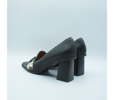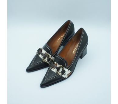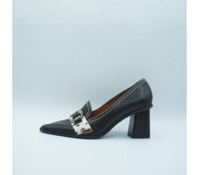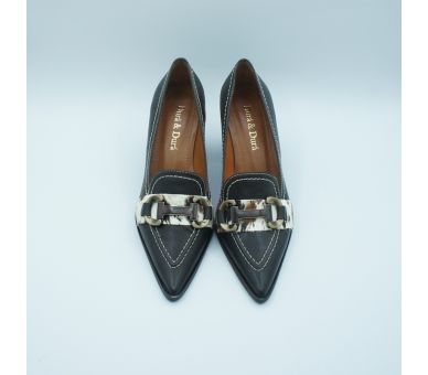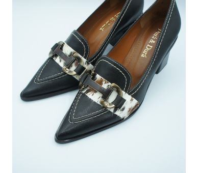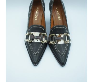 Durá y Durá nos sorprende esta temporada con este diseño de zapato estil mocasín con tacón medio, fabricado en piel de primera calidad, en color marrón chocolate, pespunteado en blanco. Acabado en punta fina con detalle sobre el empeine en piel print vaca y estribo de metal. Interior y plantilla en piel, tacón de altura 7cm con terminado efecto madera, y suela de goma antideslizante.