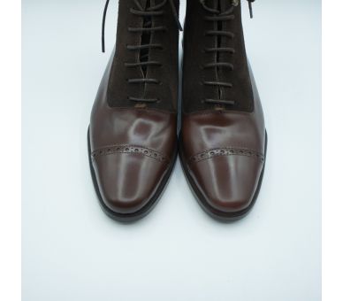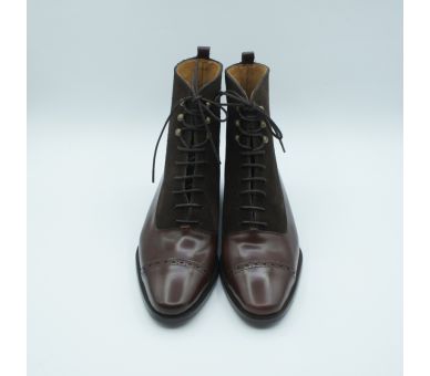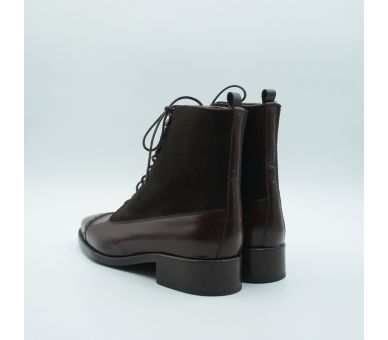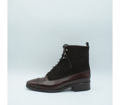 Los botines estilo inglés están presentes cada año en nuestra colección, y esta temporada hemos elegido la combinación de piel en color marrón, combinada con ante en la caña. Fabricadas de manera totalmente artesanal, con suela de cuero cosida a mano, y con una calidad extraordinaria. Puntera con detalle de picado cierre con cordones para un ajuste perfecto. Altura de caña 14cm y tacón de 3cm. Un clásico atemporal que queda muy elegante con pantalón y con falda o vestido.
