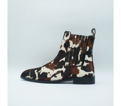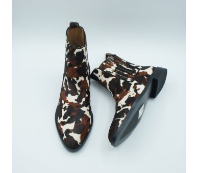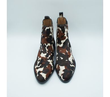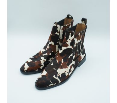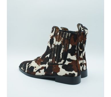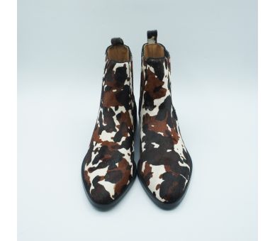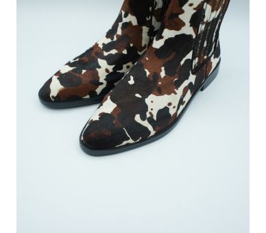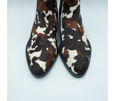 Un botín super tendencia, horma estilo chelsea fabricada en piel de potro con print vaca, combinando diferentes tonalidades marrones, negros y blancos. Interior y plantilla también en piel .Calza perfecta por los elásticos laterales, altura de caña de 14cm y tacón de 2cm.
