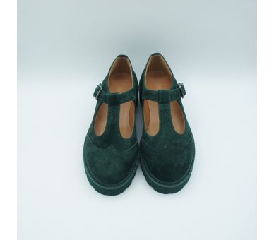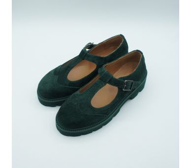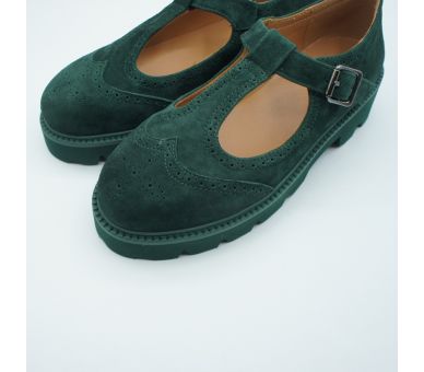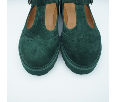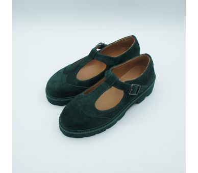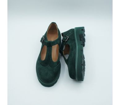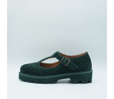 Zapato estilo merceditas de Lagum, fabricado en ante color verde con trabilla sobre el empeine y picados en la puntera. Cierre con hebilla regulable lateral. Interior y plantilla en piel y suela en goma tipo truck también en verde, con altura de 4cm.