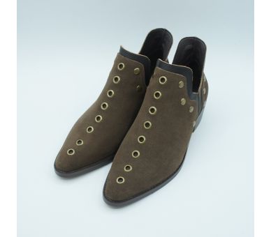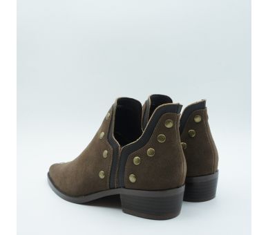Botín estilo campero de caña baja de la colección de Befree para Exé, fabricado en ante color marrón chocolate, con detalle de tachas en oro viejo y aberturas laterales. Interior y plantilla en piel y suelo sintético antideslizante. Tacón cubano de altura 4cm. Calza justo si estás entre dos números pide siempre el superior. Un botín ideal para aportarle un aire muy actual a tus looks, queda perfecto con pantalones y con vestidos.