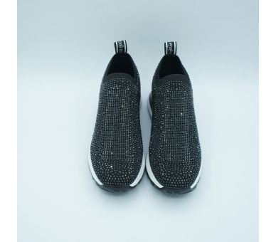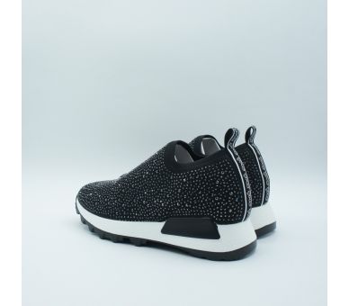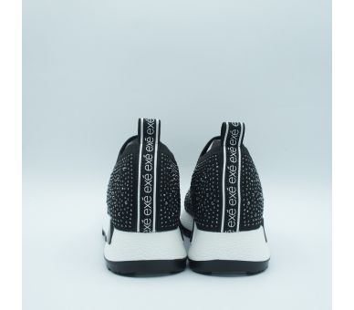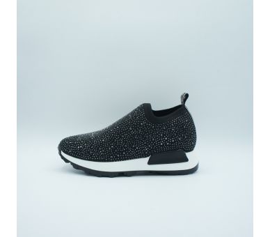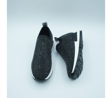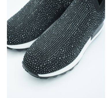 Sneaker fantasía fabricado en licra negra con detalles de strass. Suela de goma en color blanco , altura de tacón 4cm y plataforma de 2cm. Interior y plantilla textil.
