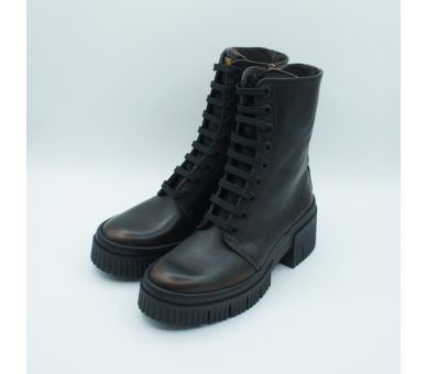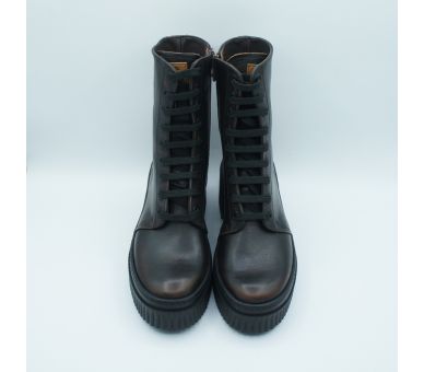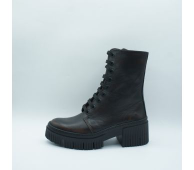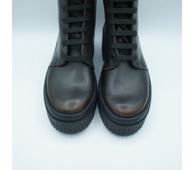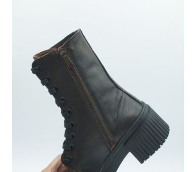 Bota estilo militar de caña media, de Art, fabricada en piel color marrón chocolate efecto envejecido. Tacón de bloque con altura de 5cm y plataforma de 3cm. Altura de caña 16cm. Cierre con cordones y cremallera lateral. Plantilla e interior en piel.