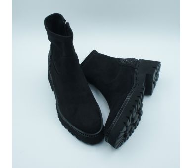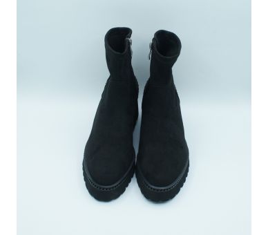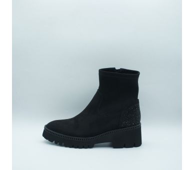 Botín negro en ante, efecto calcetín en antelina elástica. Detalle de strass en la talonera y alrededor en toda la horma. La suela track de altura tacón 5cm y plataforma de 2cm. Interior textil, cierre con cremallera lateral y plantilla de piel. Calza bien pide tu número habitual.