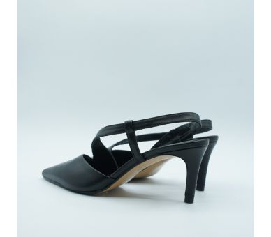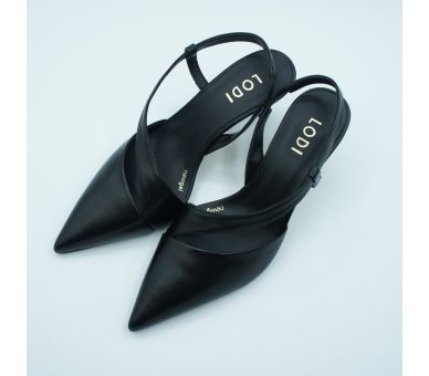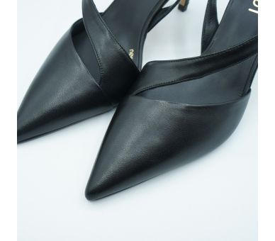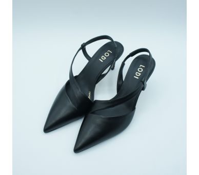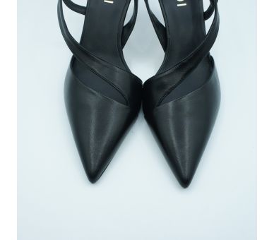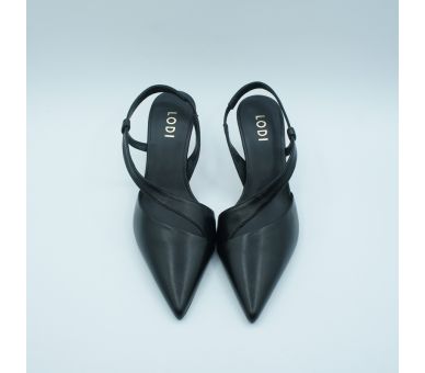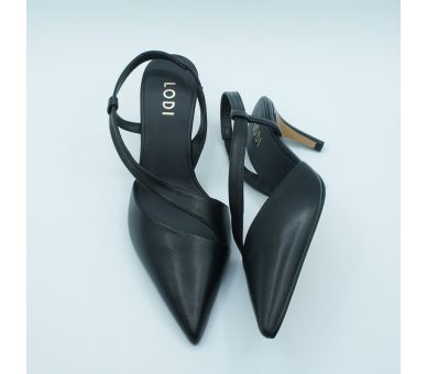 Zapato salón destalonado Naltom de Lodi fabricado en piel color negro. original detalle de tira cruzada que recorre desde la pala al talón, aportando un toque femenino y sofisticado. Fabricado con tacón fino de 6,5cm de altura. Incorpora en tira lateral elástico para un perfecto ajuste. Punta fina y plantilla en piel con new gel para mejor confort en cada pisada.