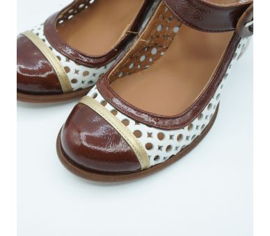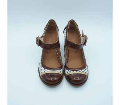 Zapato estilo retro de Nemónic, fabricado en piel color blanco troquelada y combinado con charol color caramelo, sujeta con tira ancha sobre el empeine y cierre con hebilla regulable, Original tacón forrado en estampado cuadros marrón y beig y con una altura 8cm. Calce amplio y muy cómodo.