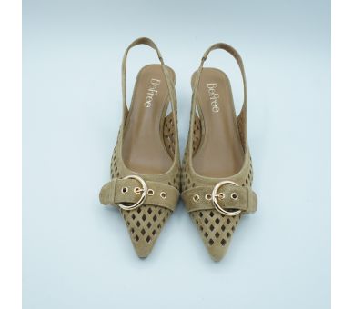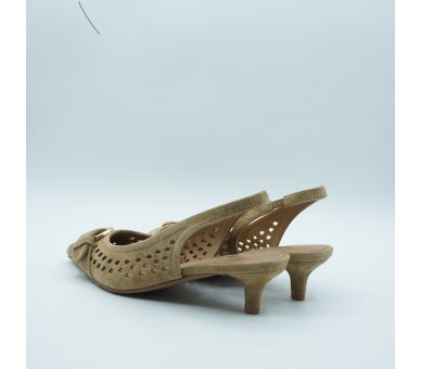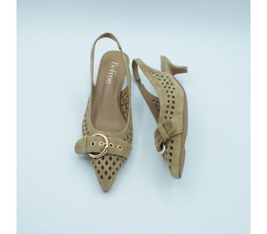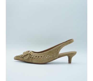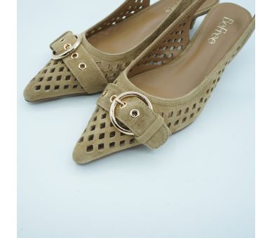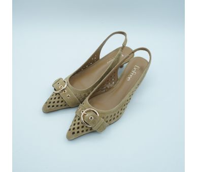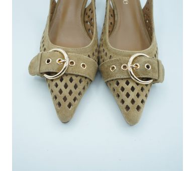 Luz natural y elegancia sin esfuerzo. Fabricados en ante troquelado y con detalle de hebilla en la puntera, estos salones aportan un aire sofisticado y delicado perfecto para elevar looks de día o completar estilismos más especiales. Tacón fino de altura 5cm , y cierre con tira al tobillo con elástico. Interior y plantilla en piel.
