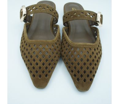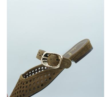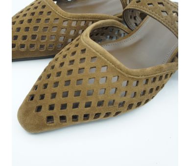 Versátiles y fáciles de combinar, estas bailarinas mule de ante en color marrón son perfectas para elevar looks de diario o completar estilismos más cuidados con un aire elegante y actual. Fabricadas en ante troquelado y con tira ancha sobre el empeine con cierre con hebilla regulable. Interior y plantilla en piel. Tacón forrado en ante con altura de 2,5cm.