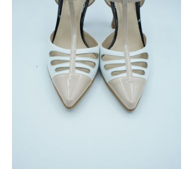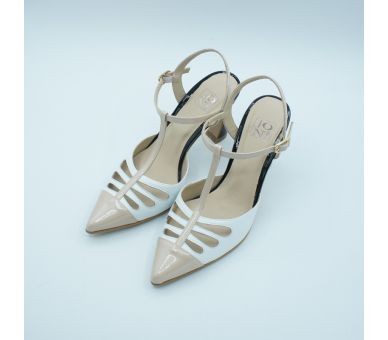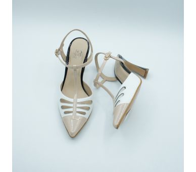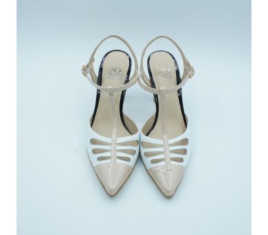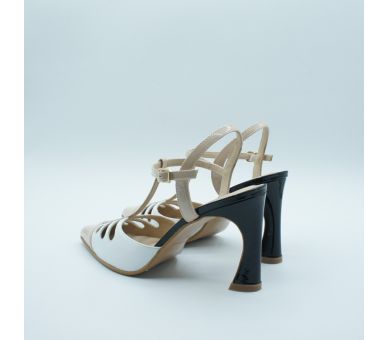Me parece ideal este salón de Joni, fabricado en piel combinado con charol y en tres tonos, blanco con nude con tacón en negro. Super elegante y cómodo. Cierre con tiras en T y pulsera al tobillo con hebilla lateral regulable. Tacón vanguardista de altura 9cm forrado en charol negro. Interior y plantilla en piel.