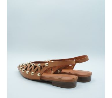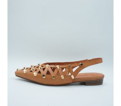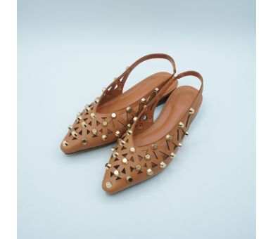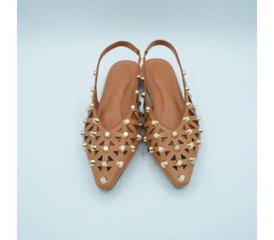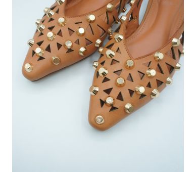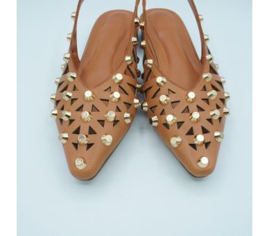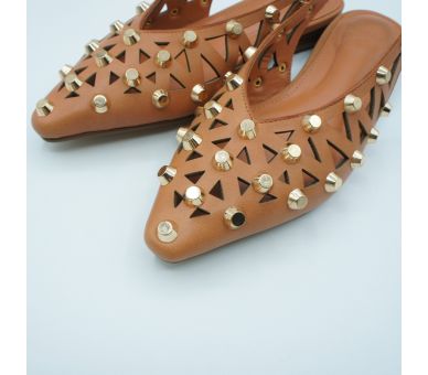 Una manoletina destalonada de Lagúm fabricada en piel troquelada color cuero-naranja, con tachas en dorado. Sienta muy bien por el corte que tiene y recoge perfectamente por los laterales, y en el empeine. Cierre con tira al tobillo con elástico. Plantilla en piel super acolchada para mayor comodidad. Tacón de 2 cm en imitación madera.