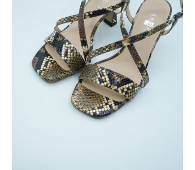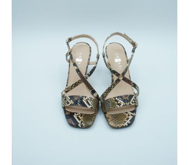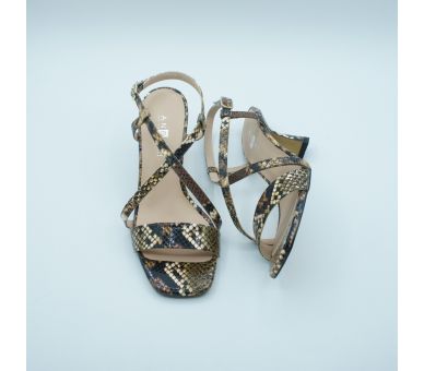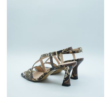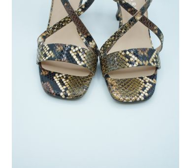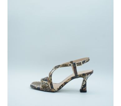 Sandalia tiras de Angari, fabricada en piel con print serpiente en tonos naturales. Tira ancha en la punta y dos tiras finas cruzadas sobre el empeine con cierre en el tobillo y hebilla regulable. Tacón forrado en la misma piel de altura 7,5 cm . Interior y plantilla en piel. Calce bueno, pide tu número habitual.