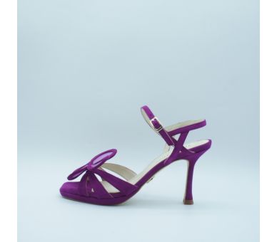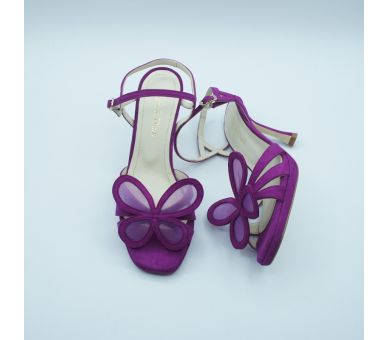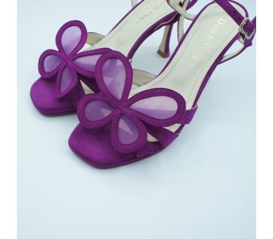 Sandalia mariposa de la colección de Durá&Durá, fabricada en ante y disponible en dos colores: bugambilia y negro. Detalle de tiras sobre el empeine y remate con detalle en rejilla de mariposa que se pude modelar o dejarlo en plano. Cierre con tira al tobilo y hebilla regulable. Tacón fino de altura 9cm y pequela plataforma en la planta de 1cm por lo que se hace muy cómoda.