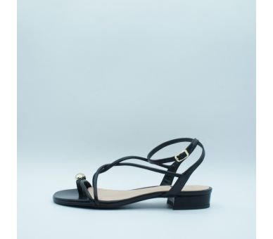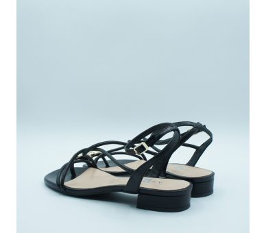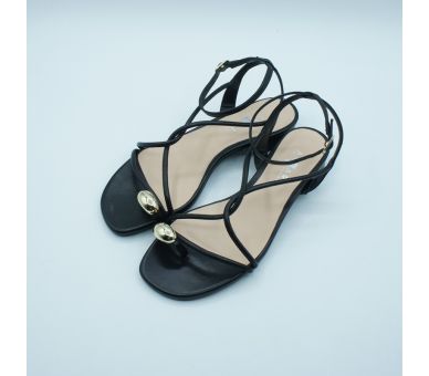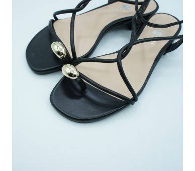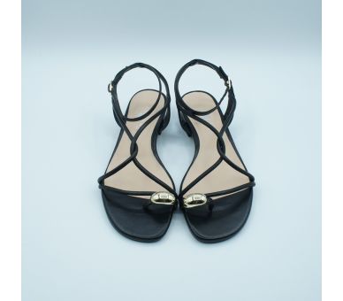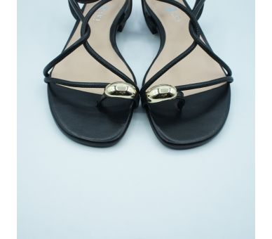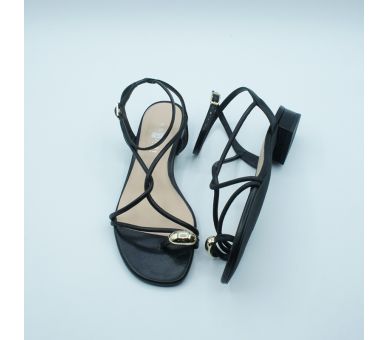 Sandalia estilo romana de Angari, fabricada en piel color negra con tiras tubulares entrelazadas sobre el empeine y tira a modo de anillo para el dedo con detalle en dorado. Cierre con tira al tobillo y hebilla regulable. Tacón de 2cm. Es una sandalia ideal para tu día a día y perfecta también para cualquier evento.