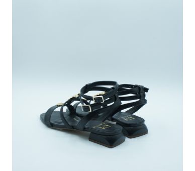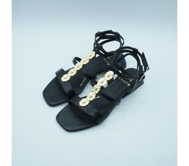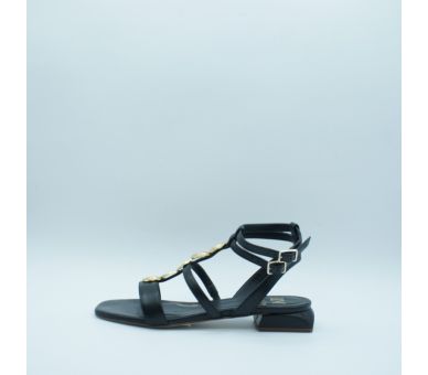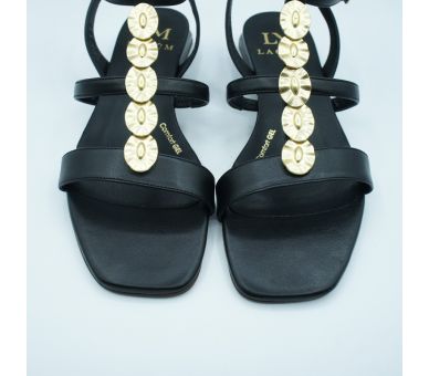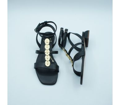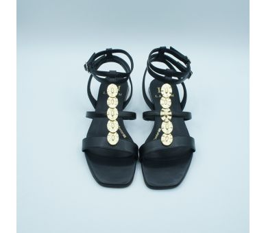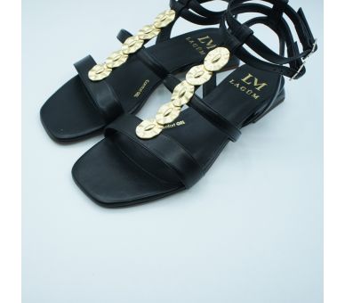 Sandalia estilo romana de Lagúm, fabricada en piel color negro con tiras finas sobre el empeine y detalle de medallas en dorado , cierre con doble tira al tobillo y hebilla regulable. Tacón geométrico de 2cm. Plantilla en piel con gel para mayor comodidad.