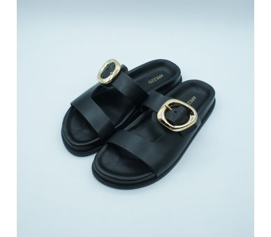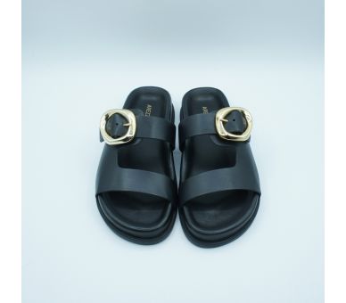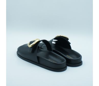 Sandalia plana BIo de Arezzo, fabricada en piel color negro, con tiras anchas en la pala sobre el empeine y hebilla en dorado en el lateral regulable para una sujección perfecta. Plantilla en piel super acolchada, para una comodidad perfecta. Una versión de la sandalia más tendencia del verano pero mucho más elegante y sofisticada por el detalle dorado. Te verás perfecta.