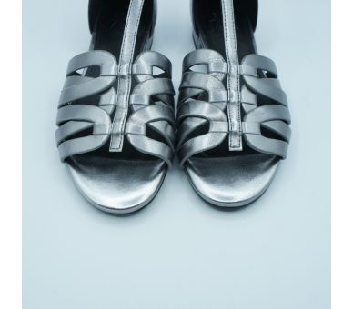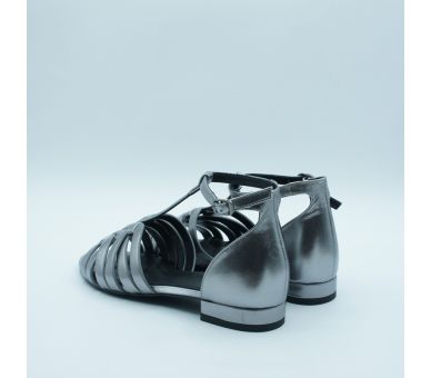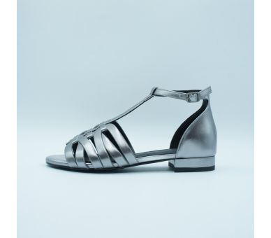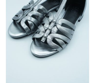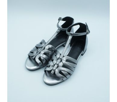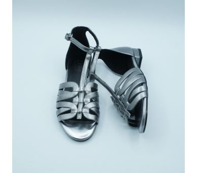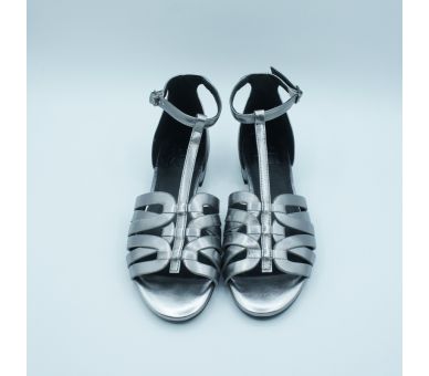 Sandalia metalizada en plata de Lagúm. Fabricada en piel con detalle de tiras en la pala y talonera muy cómoda para llevar con pantalones. Tacón bajo de altura 1,5 cm. Plantilla en piel acolchada super cómoda. Cierre con tira al tobillo y hebilla regulable.