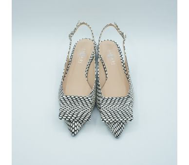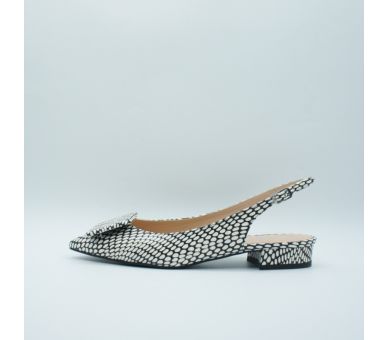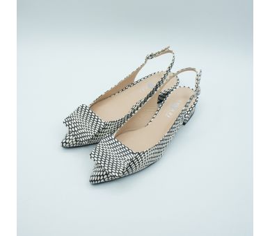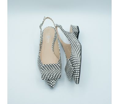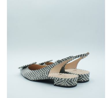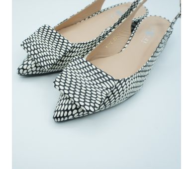 Manoletina destalonada de Angari, en esta ocasión fabricada en piel con diseño digital geométrico en blanco y negro y chapa en la puntera. Cierre con tira al tobillo y hebilla regulable. Altura del tacón 2cm, plantilla en piel.