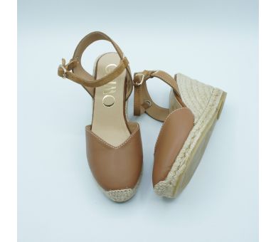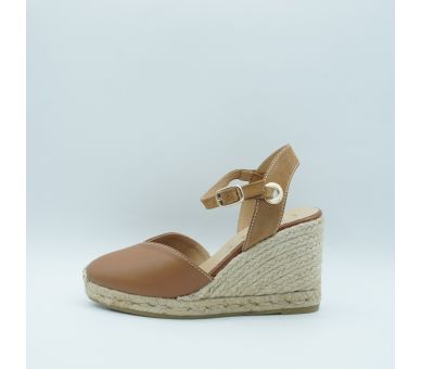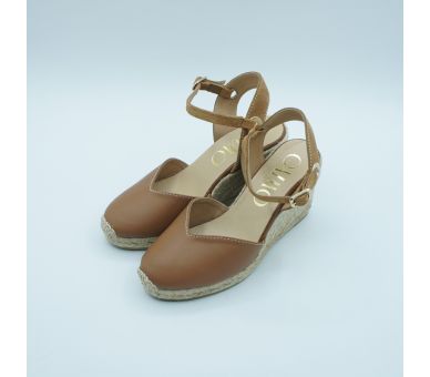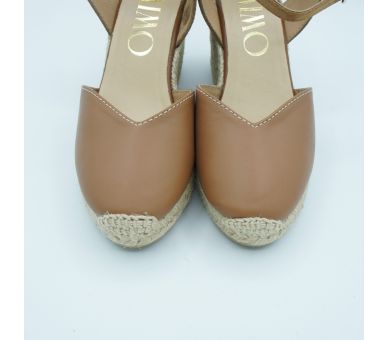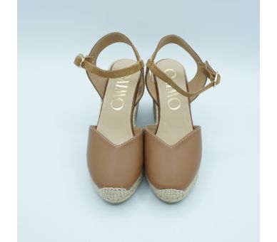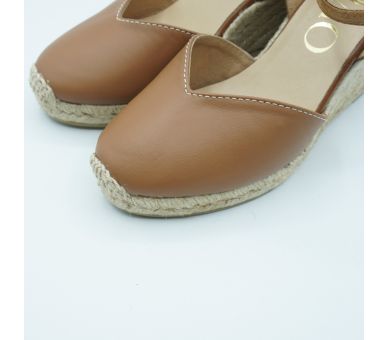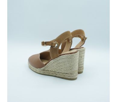 Medes es una alpargata de cuña media de diseño cerrado y punta redonda, con cierre de hebilla y acabada en piel. La trasera con detalle metálico aporta un punto sutil que ilumina el diseño con discreción.